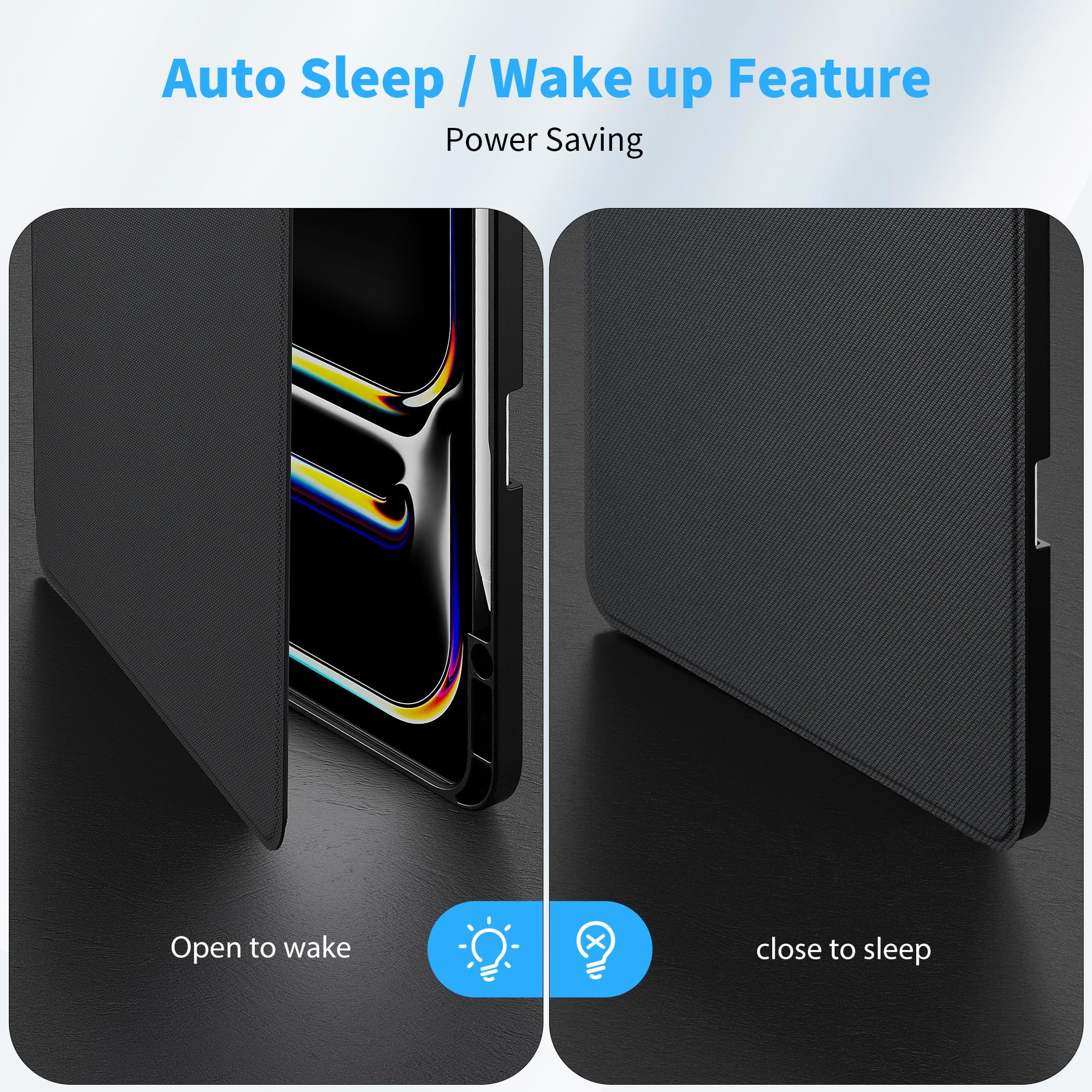 • [Auto Wachen/Schlafen] --- Der eingebaute starke Magnet weckt Ihr Tablet automatisch auf und versetzt es durch ein Umblättern wie ein Buch in den Ruhezustand. Darüber hinaus ermöglichen Sie einfaches Öffnen und sicheres Schließen.